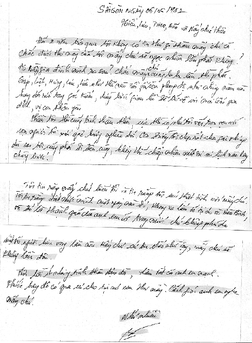 Đã 2 năm trôi qua tôi không có tin thơ gì thăm mấy chú cả. Chắc được thơ nầy của tôi mấy chú sẽ ngạc nhiên lắm phải không ? Độ nầy gia đình mình ra sao ? Chắc mấy chú cũng lu bu lắm thì phải.